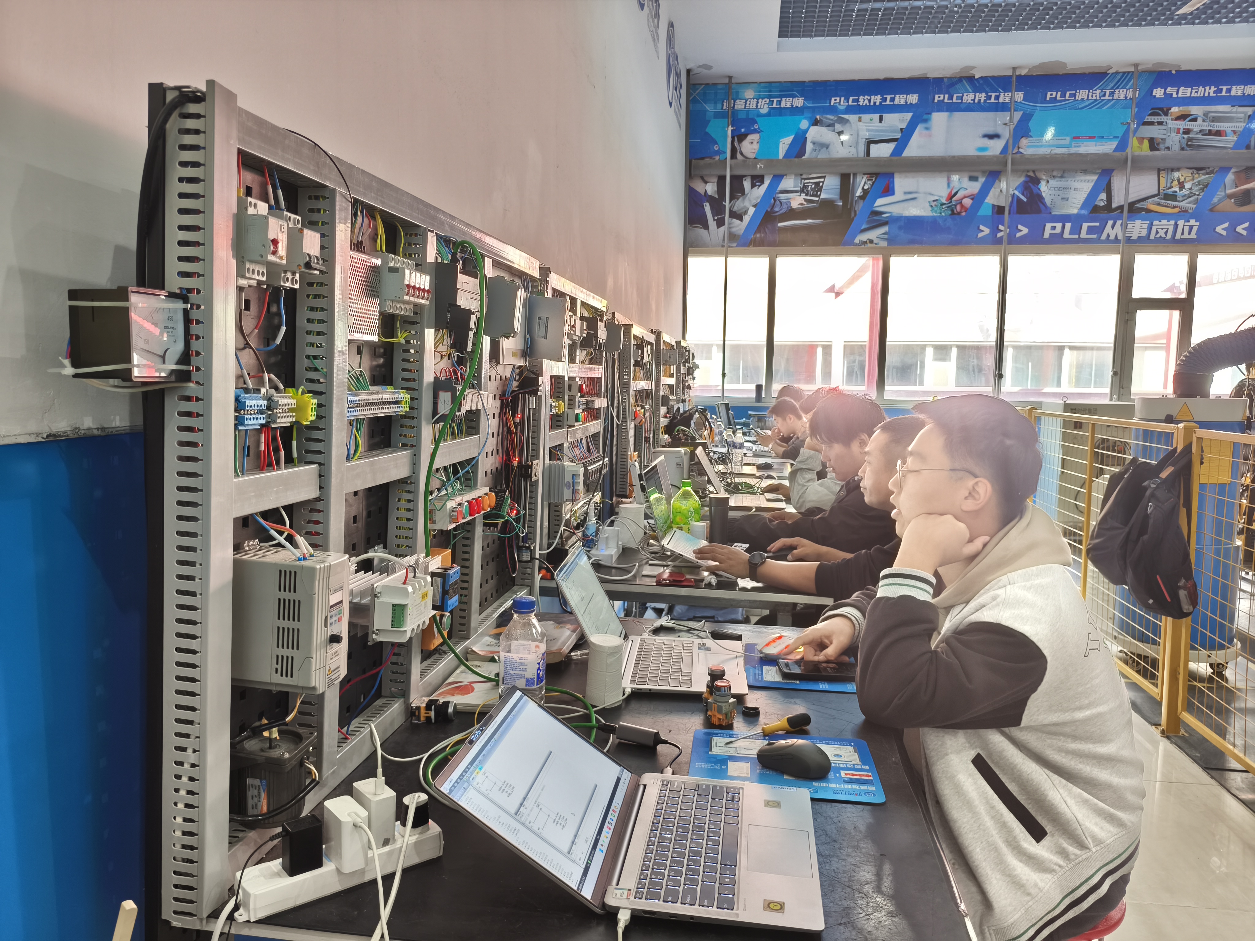 学校开设PLC电气自动化专业,课程体系分为初级、中级、高级三个层级,采用“理论+实操+项目”三维教学模式,实操课程占比达60%。零基础学员2—3个月即可掌握西门子S7-200SMART及S7-1200/1500系列的硬件构成与编程调试。设备方面,配备西门子、三菱、欧姆龙等主流品牌实训台超200套,学员可使用与春晚机器人同源的控制设备进行实操训练。